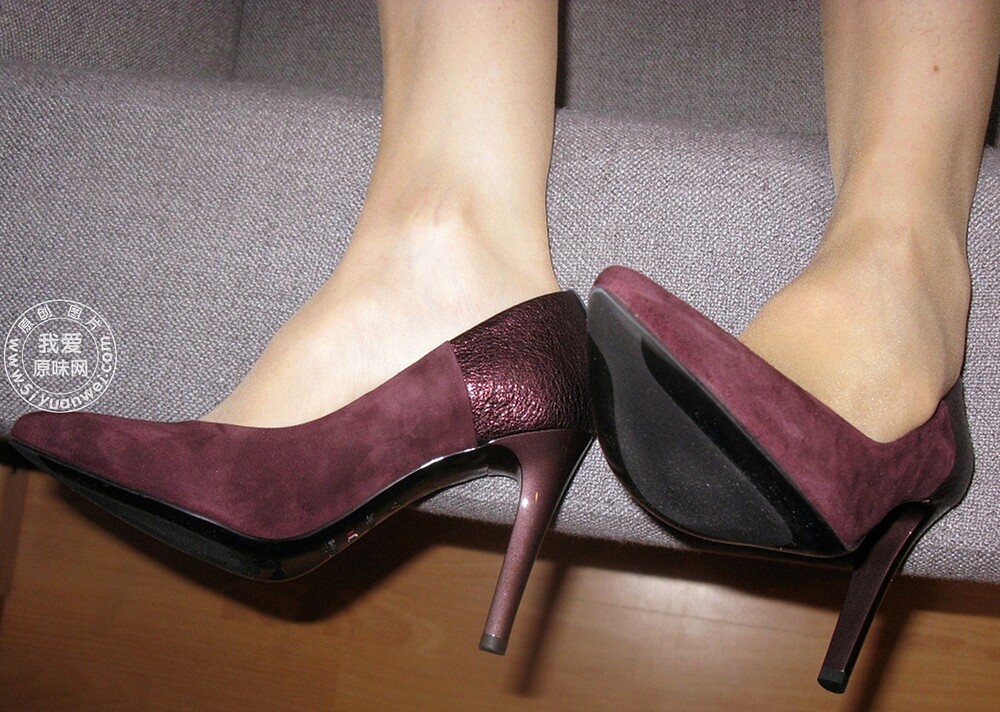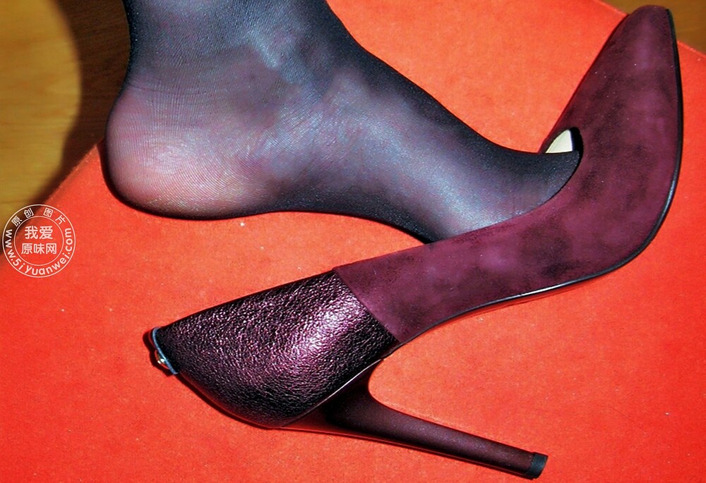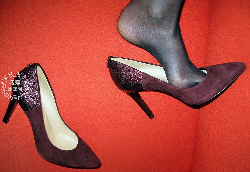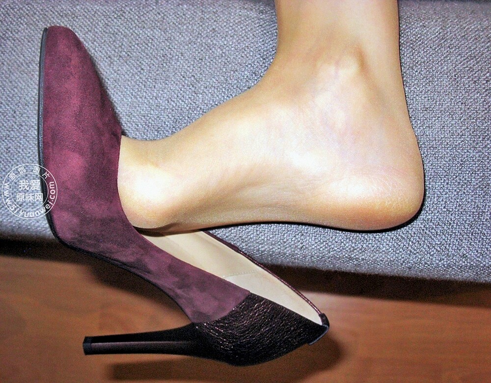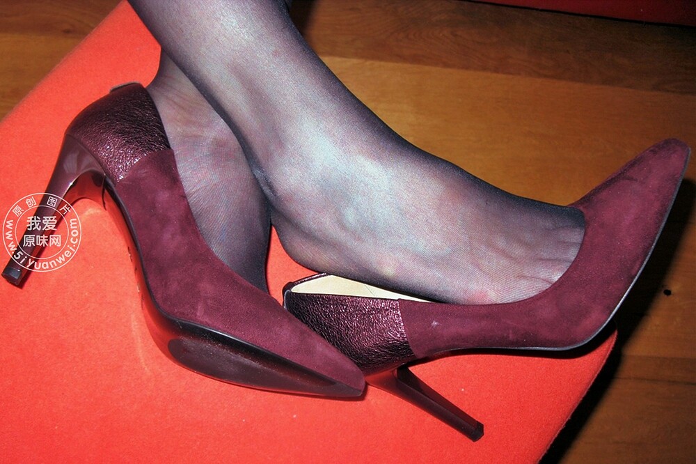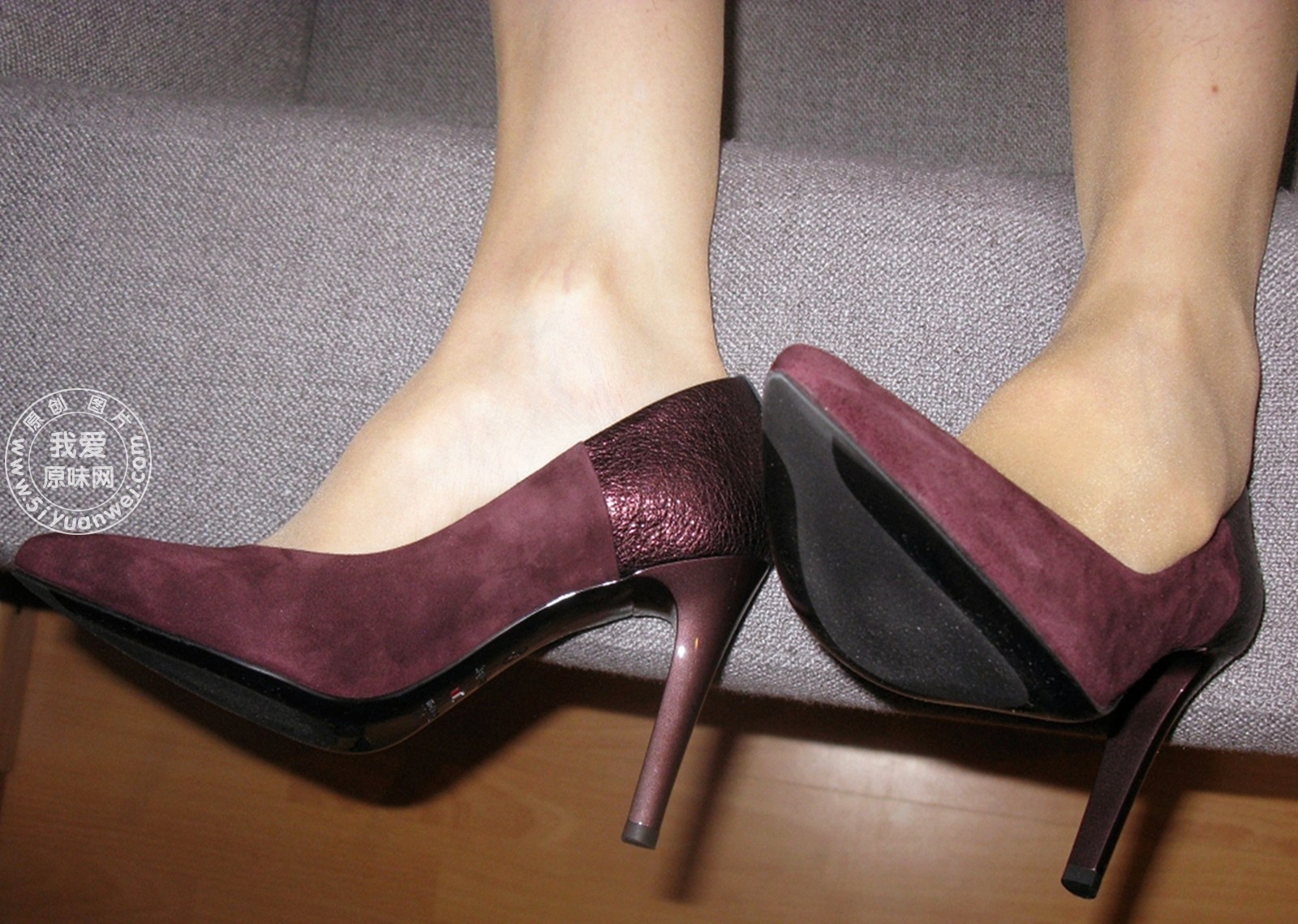 Girlfriend trying on purple high heels with shredded meat and black silk