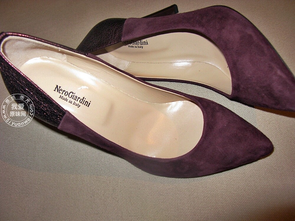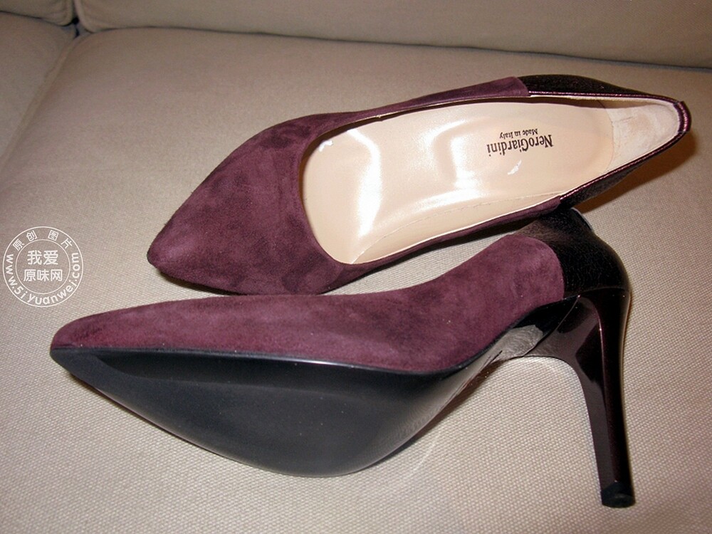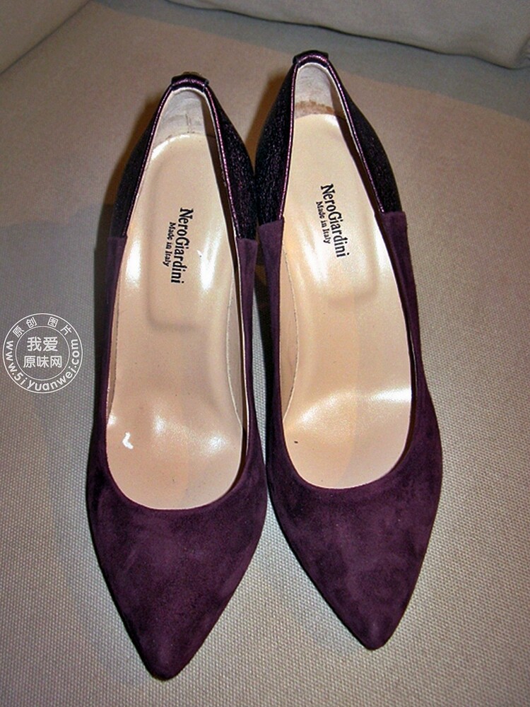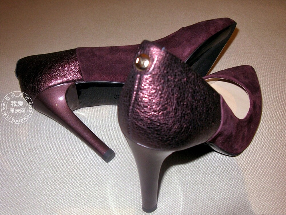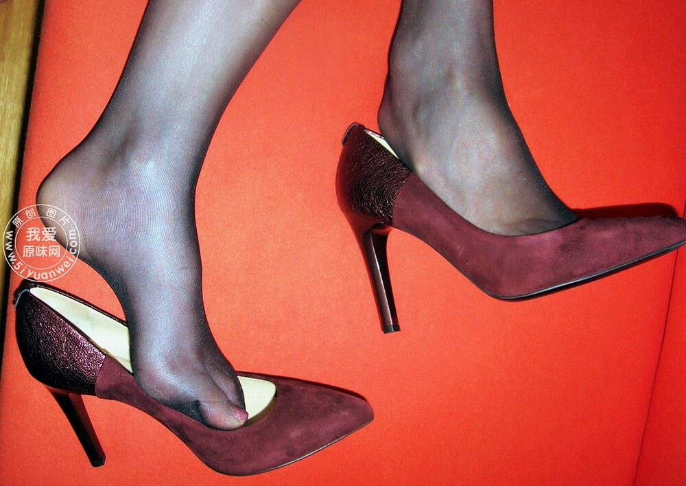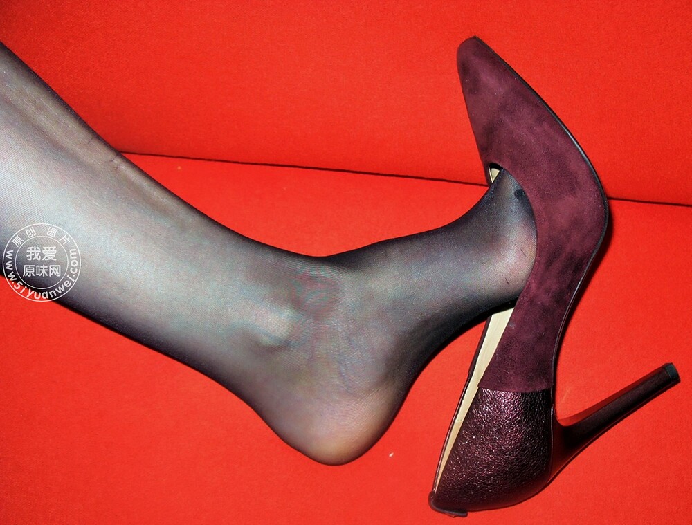 Girlfriend trying on purple high heels with shredded meat and black silk