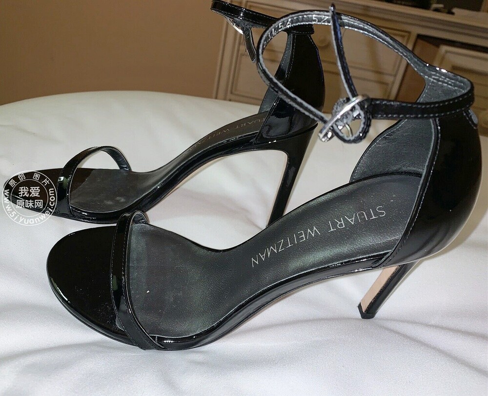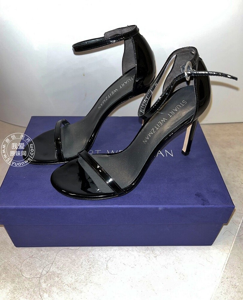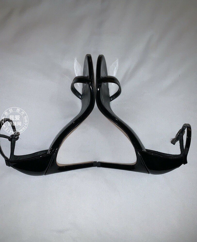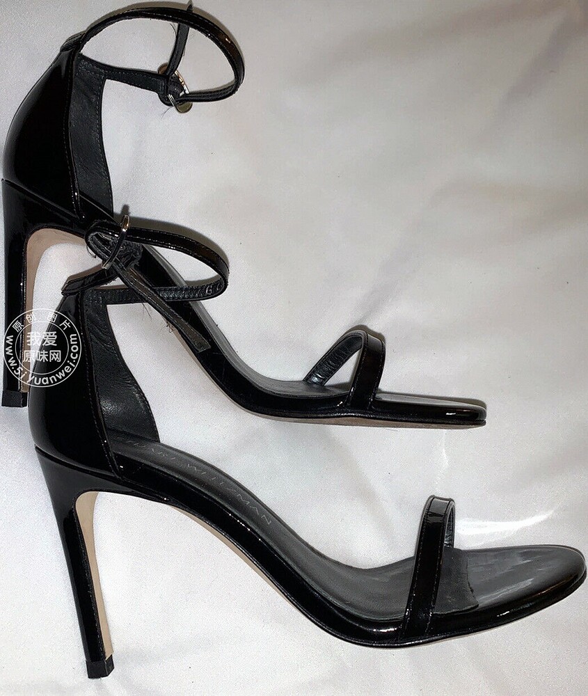 My girlfriend's SW black shiny leather high-heeled sandals with a straight strap