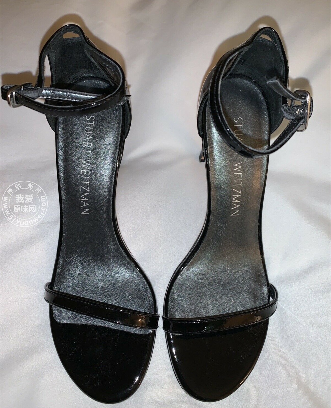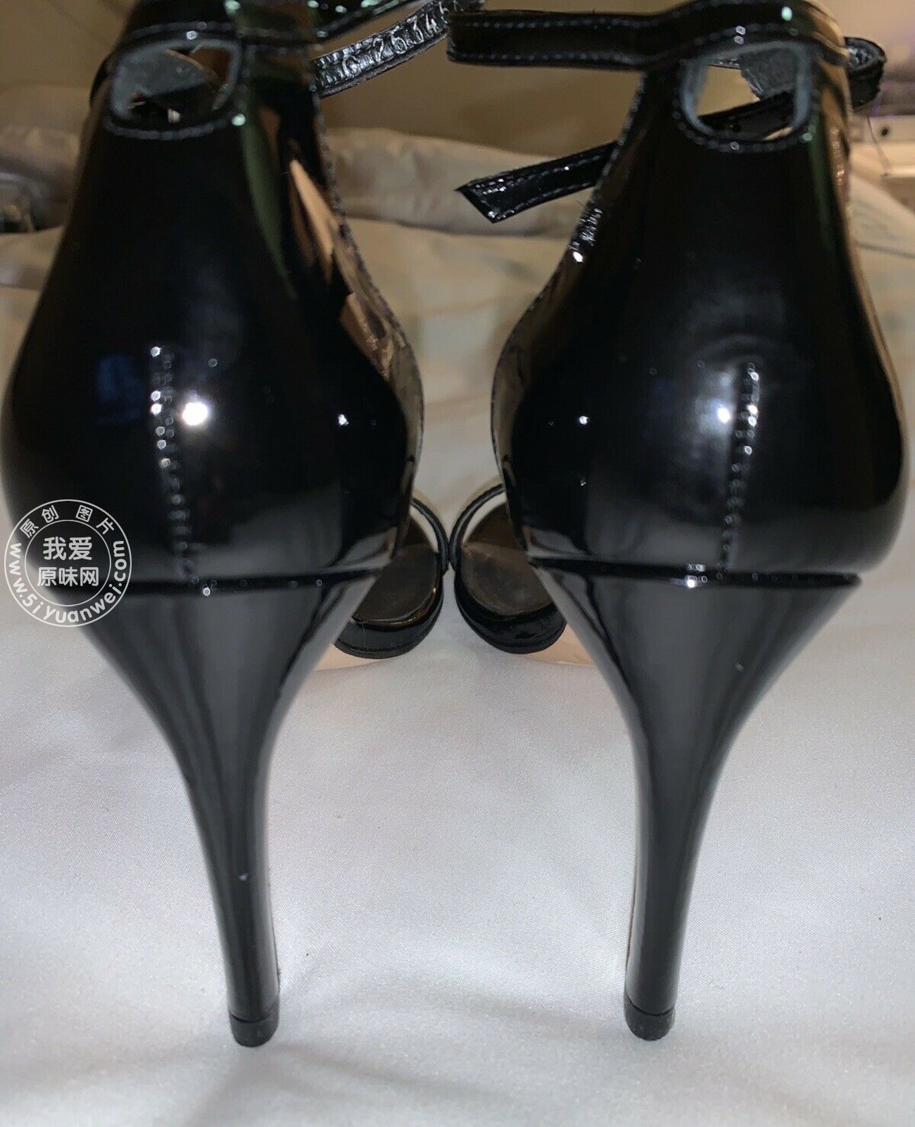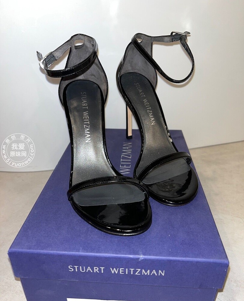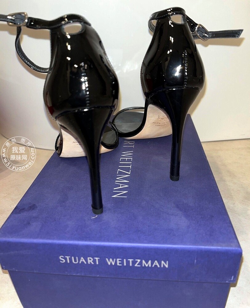 My girlfriend's SW black shiny leather high-heeled sandals with a straight strap